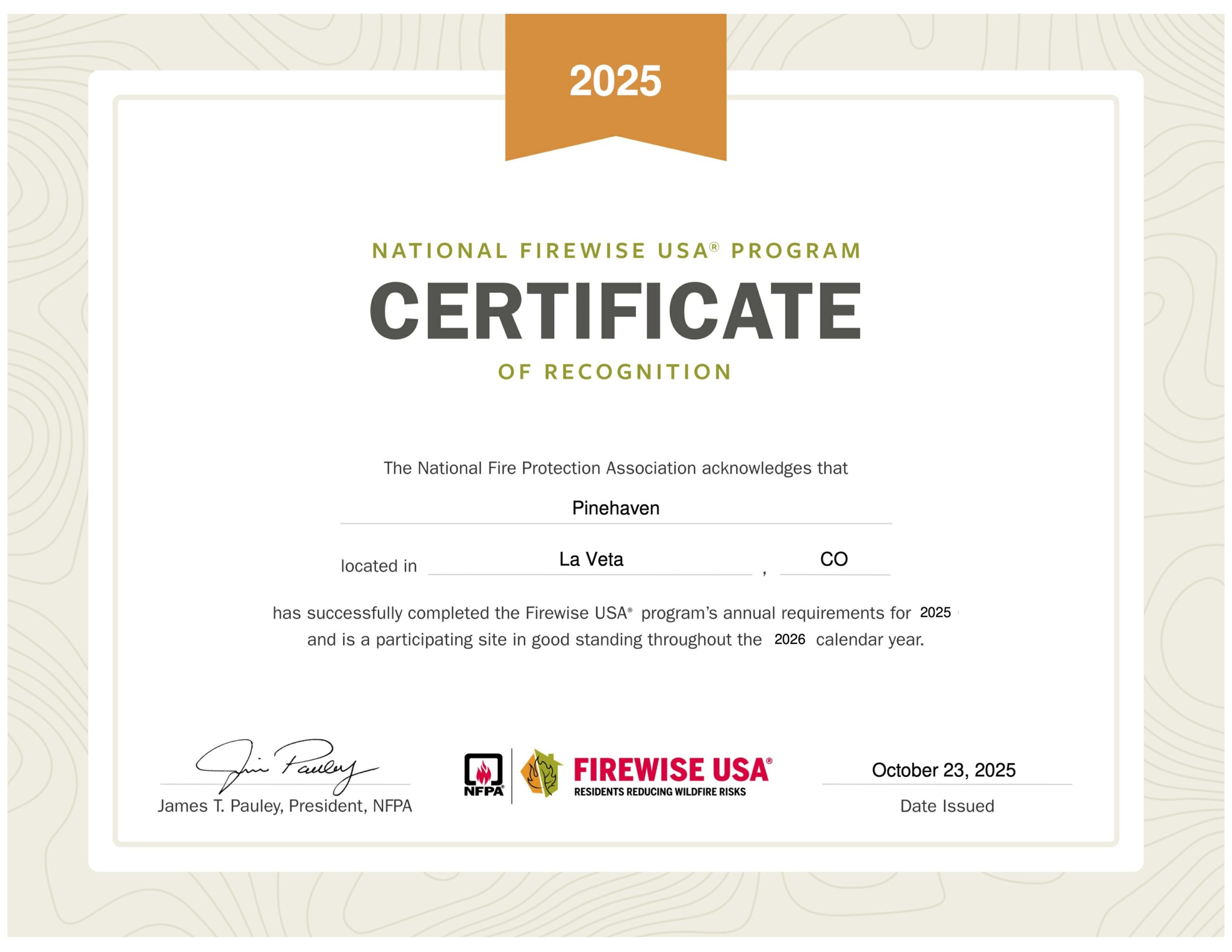 Earning Pinehaven’s annual Firewise USA® Certificate of Recognition is more than a formality. It’s national validation that the community is actively reducing wildfire risk and strengthening neighborhood pride. Each year’s certificate confirms Pinehaven met all NFPA mitigation requirements and authorizes the use of Firewise signage to show its ongoing commitment to safety. It also signals to residents, visitors, insurers, and grant agencies that Pinehaven is organized, resilient, and serious about protecting lives, property, and the forested legacy it calls home.