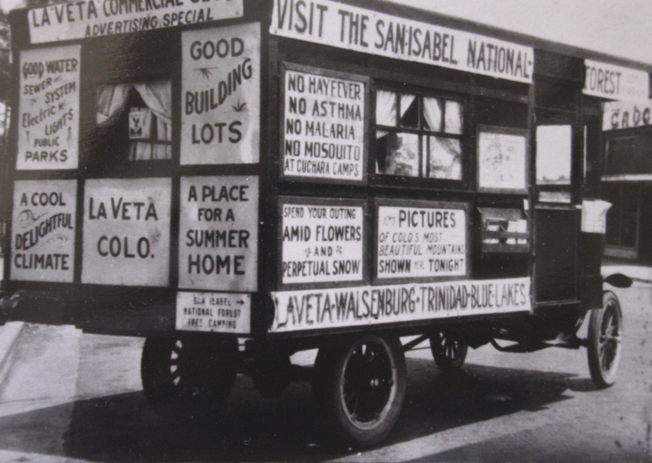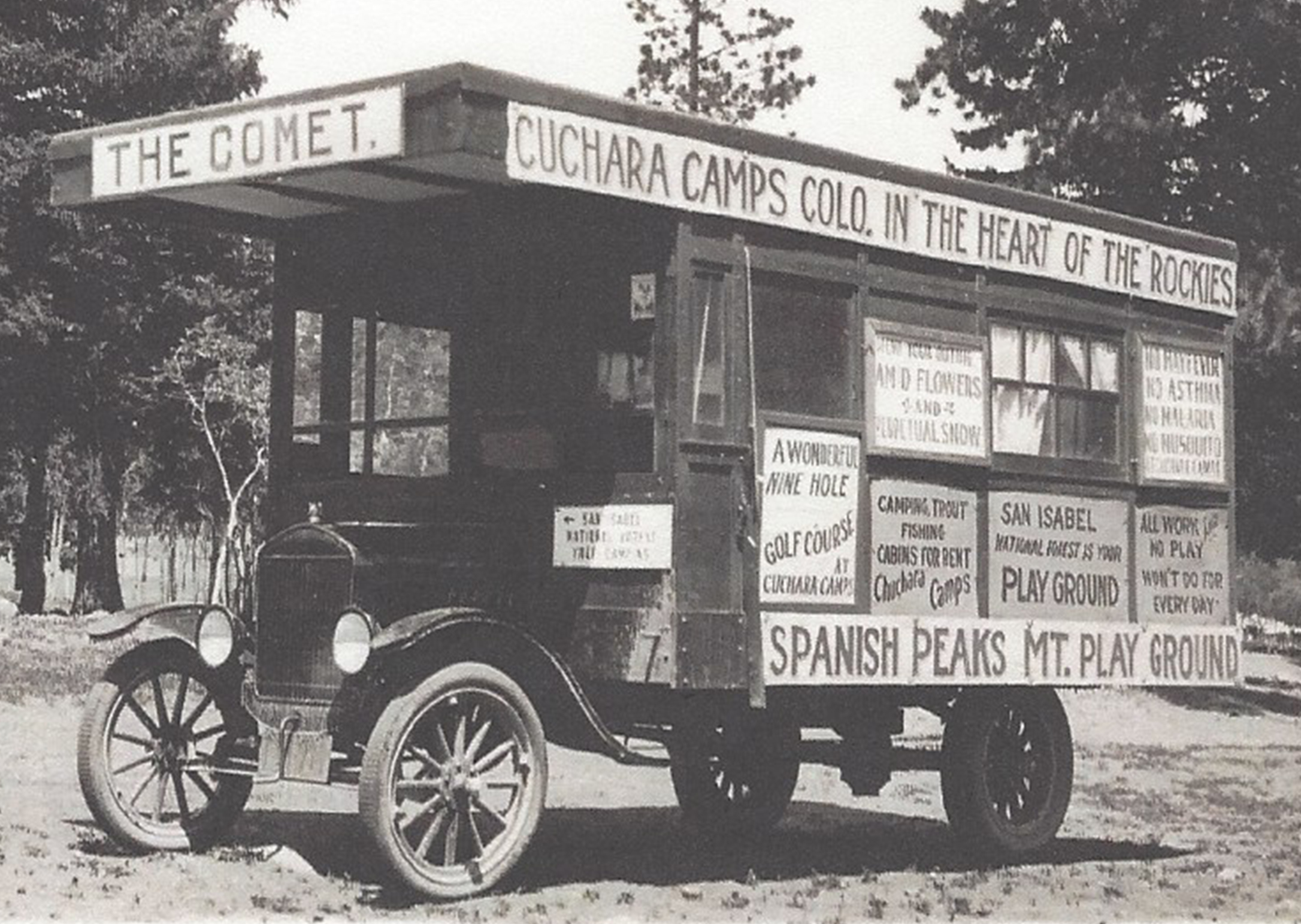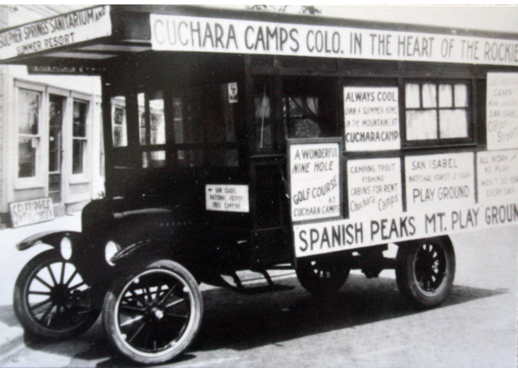 From trout fishing and cabins for rent to the lure of Blue Lakes and perpetual cool air, Mayes turned his truck into a moving invitation. It was an early twentieth-century marketing marvel that sold not just land, but a lifestyle in the heart of the Rockies. When people see old photos of Mayes’s truck, they often wonder why a “billboard” needed windows and curtains. The answer is classic George Mayes: it wasn’t just a billboard, it was also his camper. He built the box to pull double duty: advertisements on the outside, accommodations on the inside. Only George could turn a marketing campaign into a mobile cabin, promoting Cuchara by day and avoiding hotel bills by night.