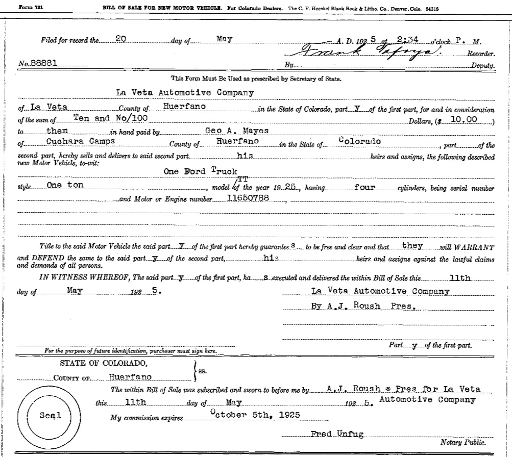 The bill of sale, signed by A. J. Roush, President, and notarized the same day in Huerfano County, lists the engine number 11,650,788, which Model TT production tables place squarely in May 1925.(9) The document was filed with the County Recorder’s Office (recorder #88881) on May 20, 1925. In other words, the famous Cuchara advertising truck may have rolled out of Ford’s system that very month, sold fresh off the line by “Roush’s Ford”, the small-town dealership that served La Veta throughout the 1920s. All evidence points to its origins at Ford’s Denver Branch Plant at 900 S. Broadway, the regional hub that supplied dealers across Colorado.