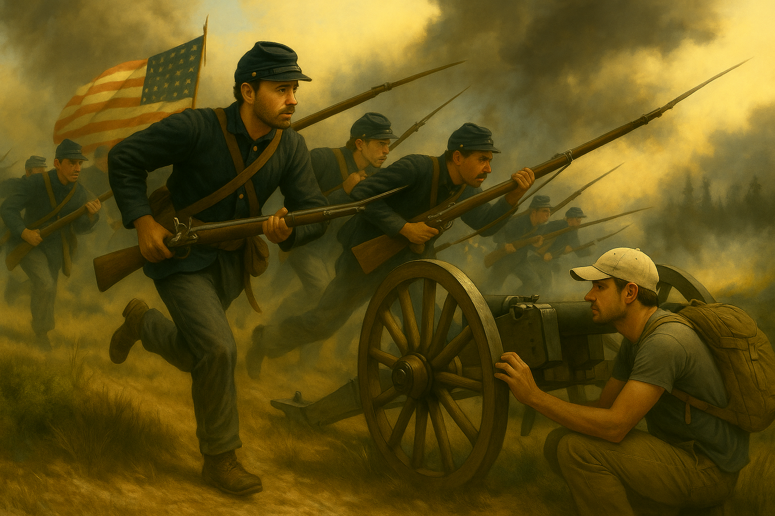 The door hung crooked, the crescent moon cutout winked like a conspirator. Some prankster carved the phrase, “TEMPORAL EXPRESS—NO TICKET, NO REFUND” on the door jamb. Eli grinned, tugged the handle, and felt the familiar rush, that stomach-drop you get at the top of a roller coaster and the scent of cold iron and pine sap. The interior darkened to a gold-black spiral and the world fell away. As he stepped out, he found himself in the middle of chaos. Drums hammered, Union troops yelling, boots thundered past, and a shell screamed overhead. The forest was gone. So was his century.