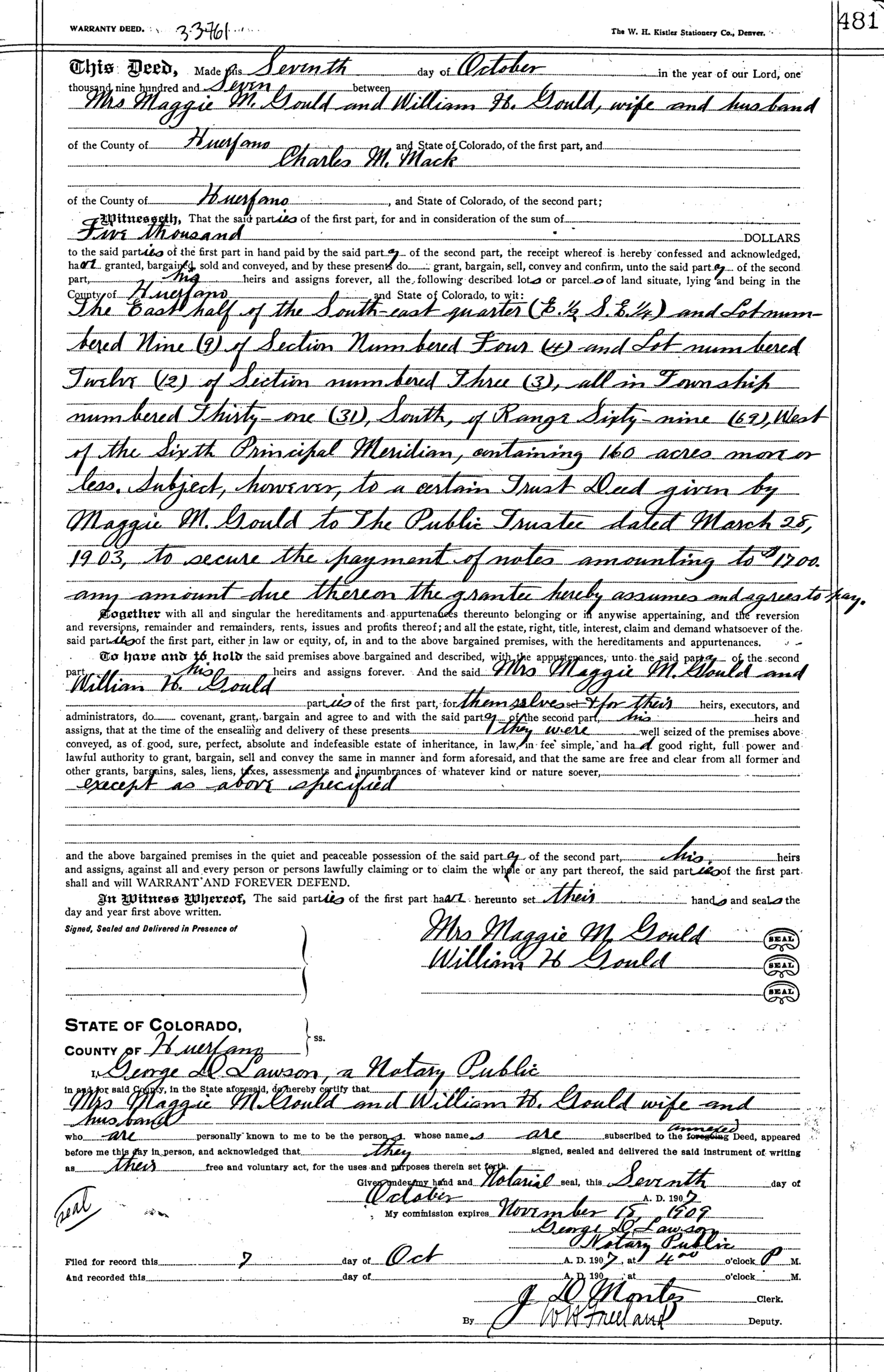 3. Warranty Deed, William J. Gould and wife to Charles M. Mack, recorded October 1907, Huerfano County Clerk and Recorder, legal description: Sections 3 and 4, Township 31 South, Range 69 West (Document Identifier: 033761 and Book/Page: GENERAL-66-481).