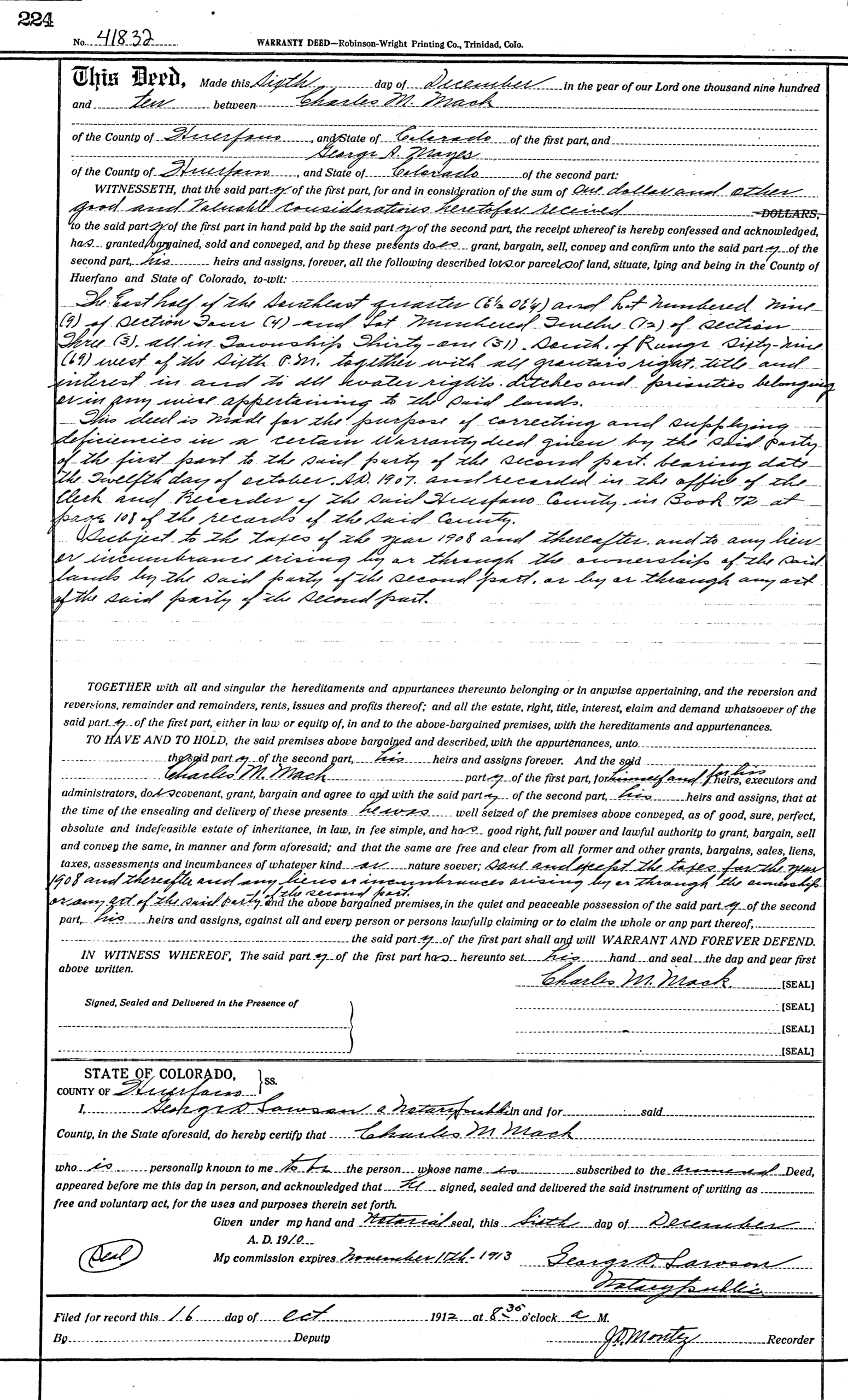 5. Warranty Deed, Charles M. Mack to George A. Mayes, recorded December 6, 1910, Huerfano County Clerk and Recorder (Document Identifier: 041832 and Book/Page: GENERAL-83-224).